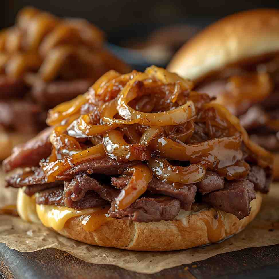 - Step 6: Assemble the Sandwiches : Spoon the cheesy beef and onion mixture evenly into each toasted roll. Serve hot, with melted cheese dripping through the soft bread — perfection!