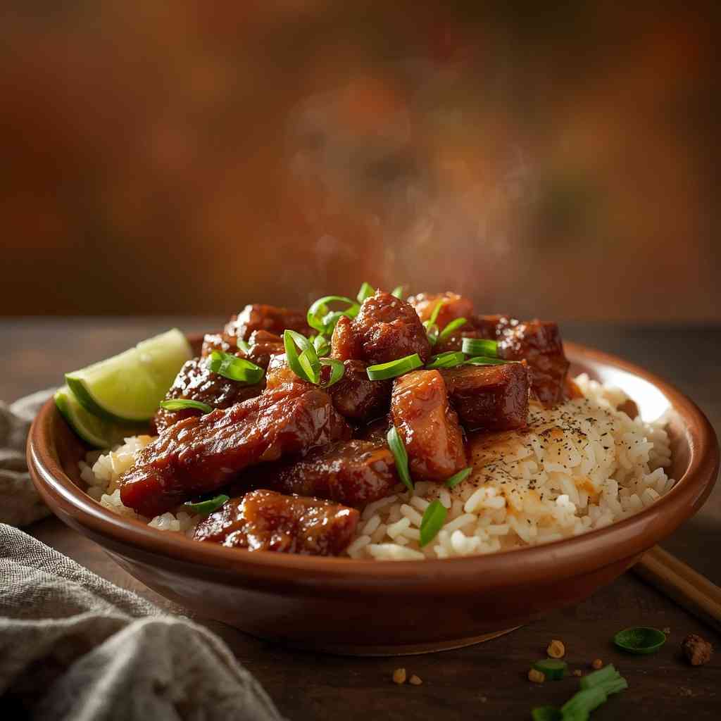 What makes this dish truly special is how effortless yet rewarding it is. You only need simple pantry staples, but the slow simmering transforms the pork into tender perfection, while the sauce thickens into a glossy, flavorful glaze. When paired with golden, garlicky fried rice, it’s pure magic on a plate.
