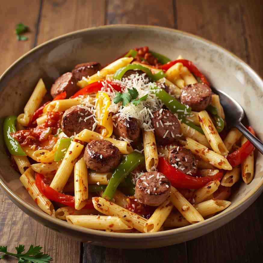- Step 5: Combine Pasta and Sauce : Add the cooked penne pasta into the skillet with the sausage and peppers. Toss well until the pasta is evenly coated with sauce. Stir in Parmesan cheese and a splash of pasta water (if needed) for a silky finish.