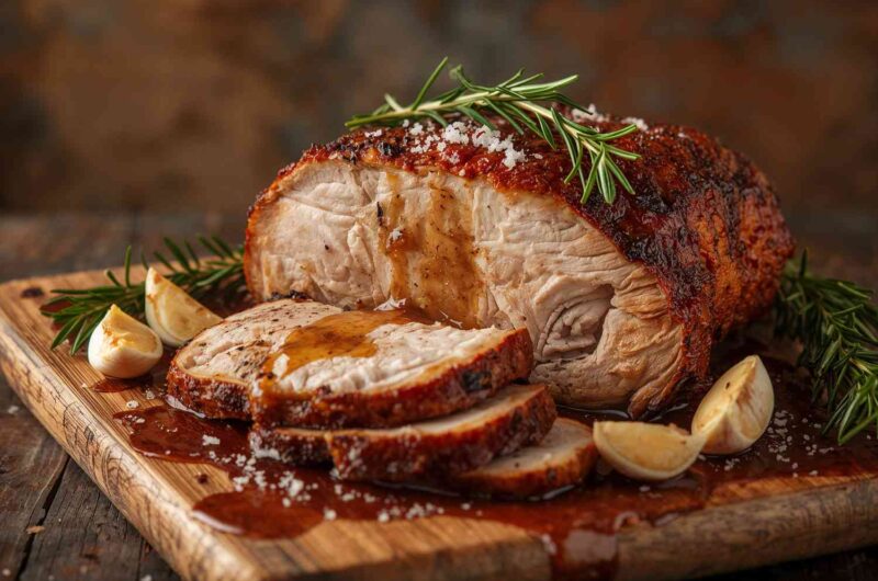 This roast is perfect for family dinners, special occasions, or holiday gatherings. The combination of garlic and rosemary enhances the natural flavor of the pork, while the slow-roasting process ensures tenderness and juicy results. Each slice is flavorful and satisfying, offering a comforting and rustic meal reminiscent of traditional European roasts.