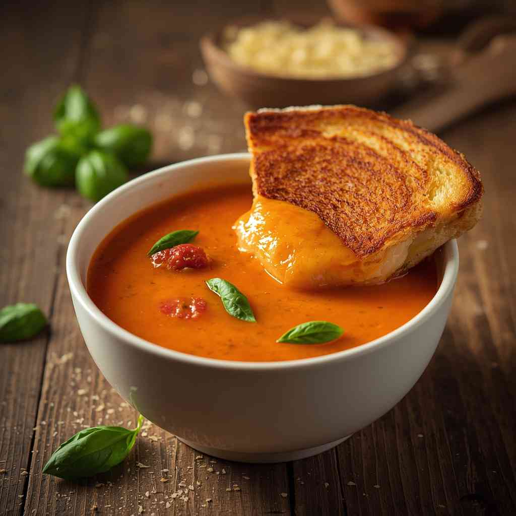 Roasted Tomato Basil Soup with Grilled Cheese is the ultimate comfort food combination — creamy, savory, and aromatic tomato soup paired with a perfectly crisp, melty grilled cheese sandwich. Roasting the tomatoes intensifies their natural sweetness and deepens the flavor of the soup, while fresh basil adds a fragrant, herbal note that complements the richness of the tomatoes.