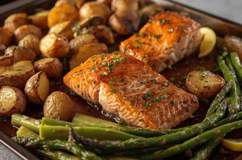 Sheet Pan Salmon with Roasted Potatoes and Asparagus is the kind of meal that brings together freshness, simplicity, and balanced nutrition in one beautiful pan. This dish gives you perfectly flaky salmon, crispy golden potatoes, and tender asparagus all roasted to perfection at the same time.
