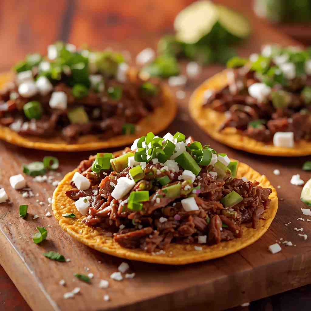 - Step 3: Assemble the Tostadas : Spread a layer of warm refried beans on each tostada shell. Add a generous portion of shredded beef. Drizzle salsa verde over the top. Add shredded lettuce, cheese, and a dollop of sour cream. Garnish with fresh cilantro and a squeeze of lime juice.