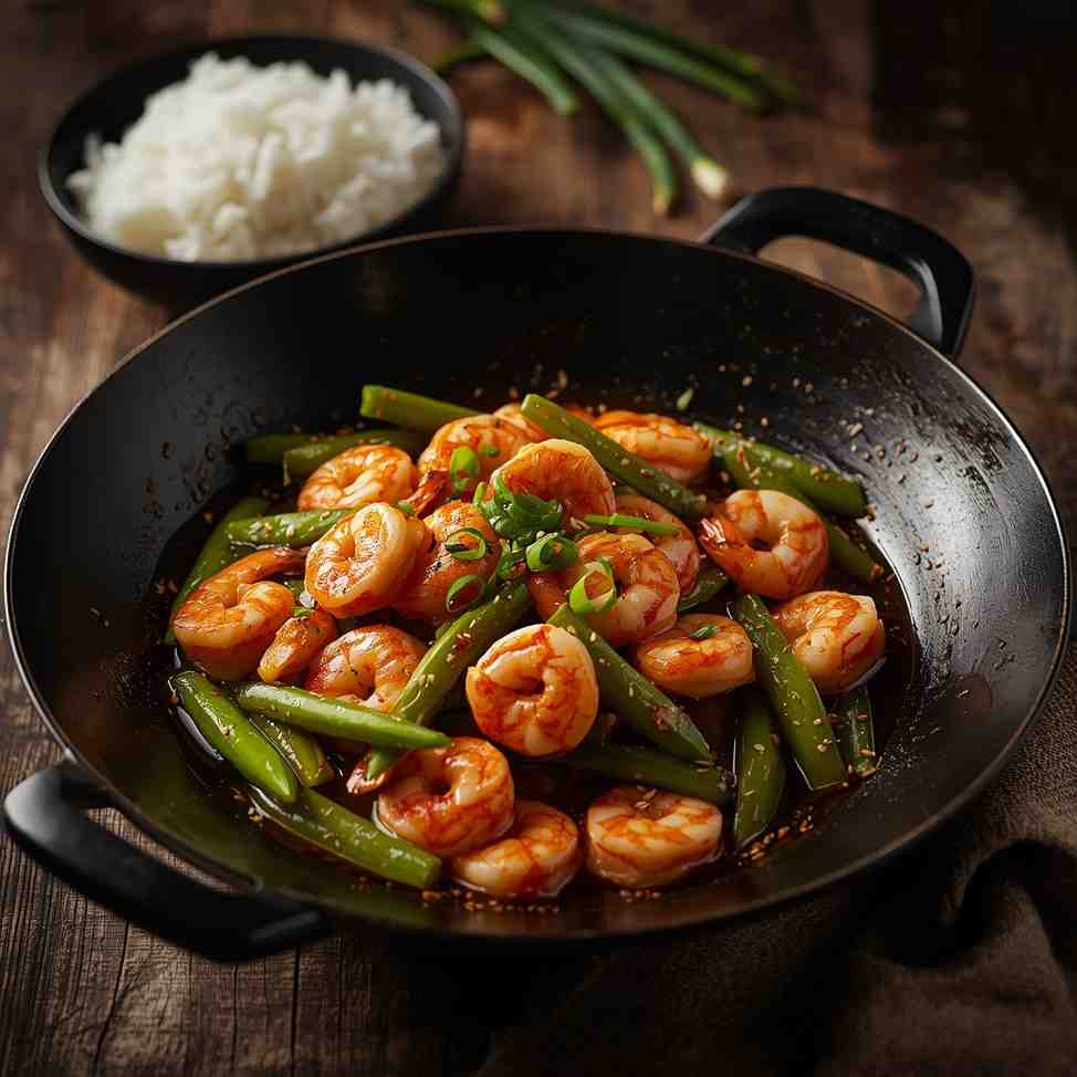 • Step 5: Combine Everything : Return shrimp to the pan. Pour in the prepared garlic sauce. Toss everything together, stirring constantly, for about 1–2 minutes until the sauce thickens and coats the shrimp and vegetables evenly.