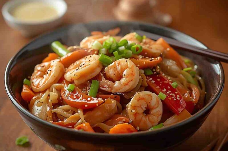 Fast, flavorful, and full of color — this Shrimp Ramen Stir-Fry with Veggies is the kind of dish that brings together the best of both worlds: comfort and freshness. It’s everything you love about a bowl of ramen — chewy noodles, umami-packed sauce, and satisfying textures — transformed into a quick and vibrant stir-fry.