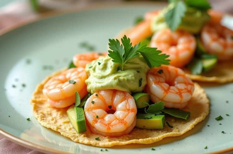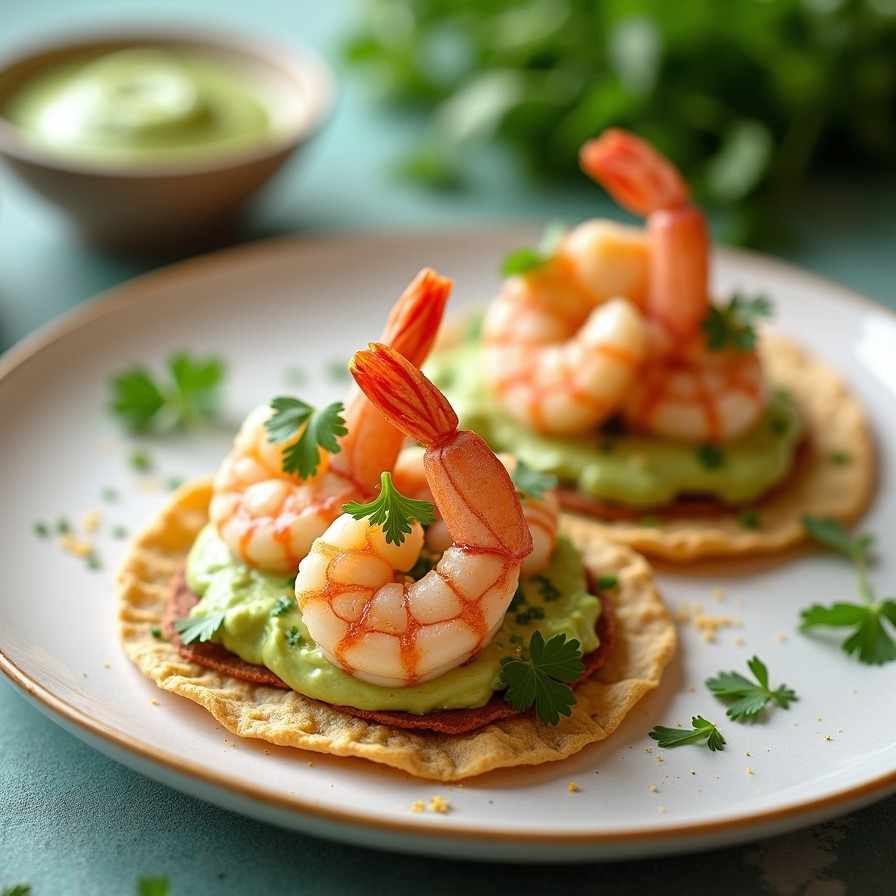 Shrimp Tostadas with Creamy Avocado Crema are a vibrant, flavor-packed dish inspired by Mexican coastal cuisine. Crispy tostada shells are topped with seasoned, pan-seared shrimp and finished with a smooth, tangy avocado crema that brings everything together.