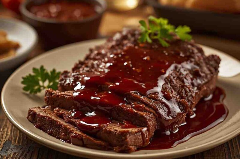 - Optional finish: For a caramelized crust, remove brisket from slow cooker and broil in the oven at 400°F (200°C) for 5–10 minutes, brushing with extra BBQ sauce.