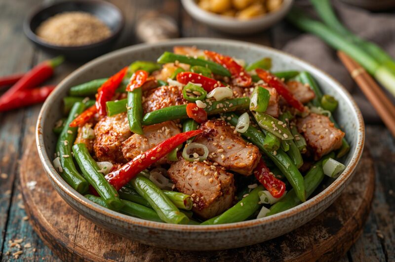 Spicy Szechuan Pork with Green Beans is a bold, flavorful Chinese-inspired dish that combines tender pork slices with crisp green beans in a fiery, aromatic Szechuan sauce. Bursting with heat, garlic, ginger, and umami, this dish delivers the perfect balance of spice, savoriness, and freshness.