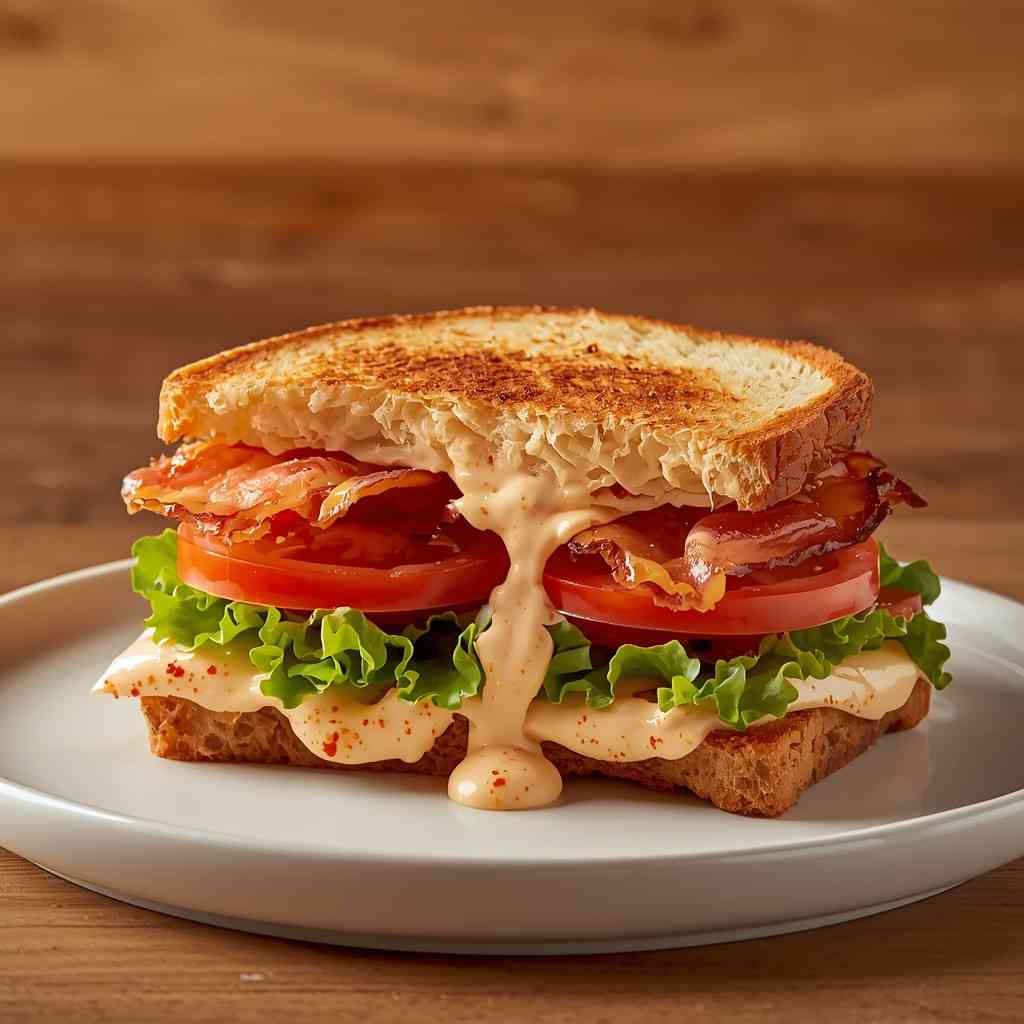 • Step 4: Assemble the Sandwich : Spread spicy mayo generously on one side of each toasted bread slice. Layer lettuce leaves, followed by tomato slices, and crispy bacon. Top with the second slice of bread (mayo side down). Press gently, then cut diagonally for a classic presentation.