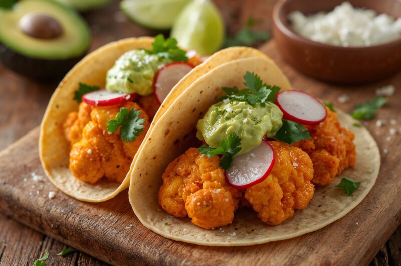 Buffalo Cauliflower Tacos with Avocado Crema are a spicy, creamy, and satisfying plant-based twist on traditional buffalo wings. Roasted or air-fried cauliflower florets are coated in a tangy and spicy buffalo sauce, then nestled into soft tortillas and topped with a smooth, cooling avocado crema. Fresh toppings like shredded cabbage, cilantro, and lime juice balance the heat and add crunch and freshness.