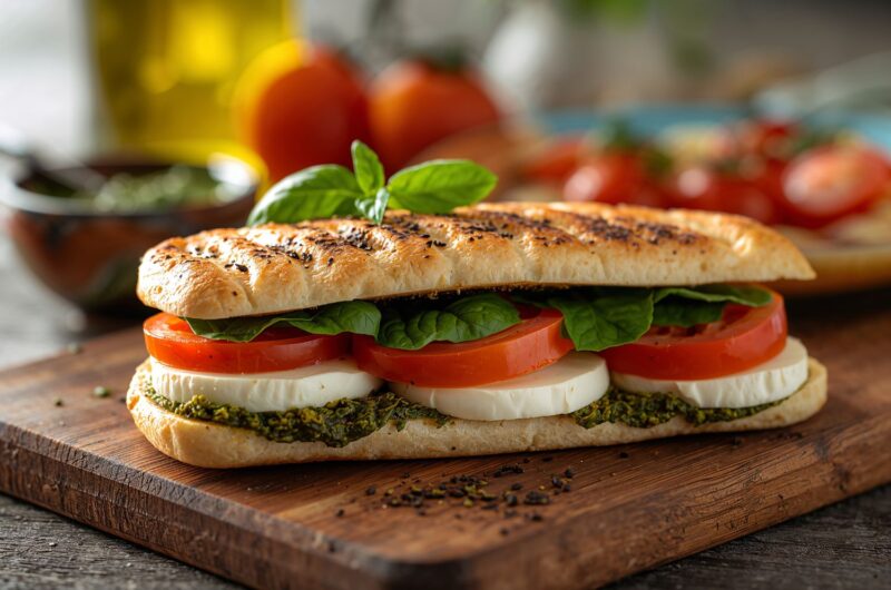 The Caprese Panini with Pesto and Mozzarella is a fresh, flavorful twist on the classic Italian Caprese salad, transformed into a warm, melty, handheld sandwich. With layers of ripe tomatoes, fresh mozzarella, aromatic basil, and a generous spread of pesto, this panini is grilled to perfection until the bread is golden and crispy.