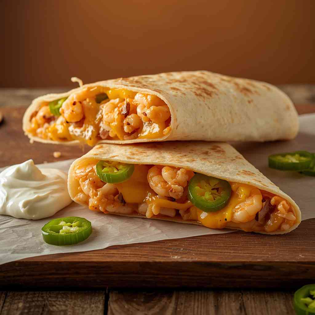 - Place a tortilla on a flat surface, sprinkle half the cheese over one side, layer shrimp, onions, jalapeños, and remaining cheese. Fold the tortilla over.