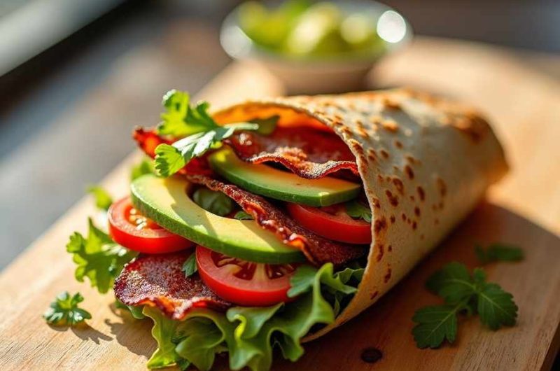 The avocado adds richness and a smooth texture that perfectly complements the salty crunch of bacon and the juiciness of tomatoes. Quick to assemble yet packed with flavor, this wrap is perfect for lunch, a picnic, or even a light dinner.