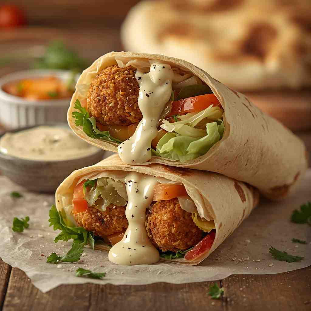 • Step 5: Assemble the Wraps : Warm pita or flatbreads slightly to make them pliable. Spread a generous layer of garlic sauce over each wrap. Arrange lettuce, tomato, cucumber, onion, and pickles. Add 3–4 falafel balls (or flatten slightly). Drizzle more garlic sauce on top. Roll up the wrap tightly and cut in half if desired.