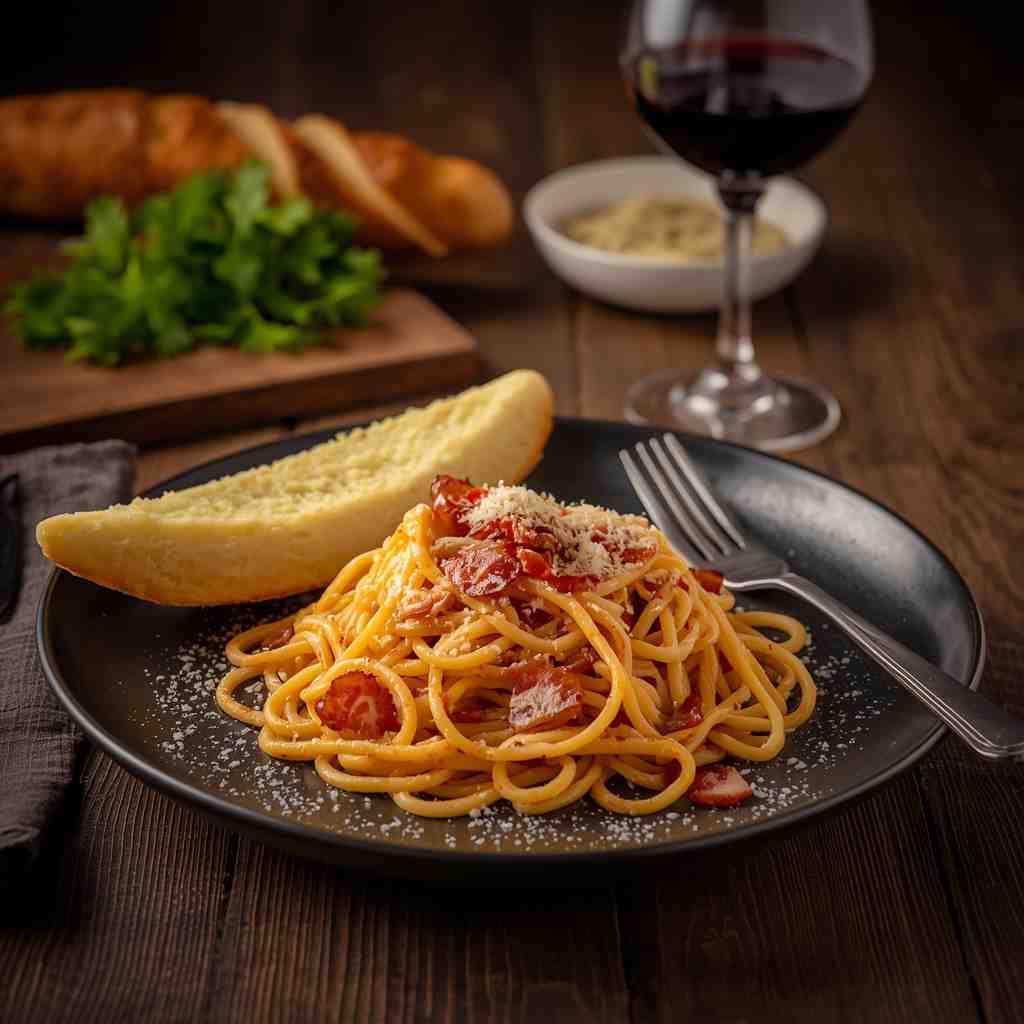Spaghetti Carbonara with Garlic Bread is the epitome of Italian comfort food — a rich, creamy, and savory pasta dish paired with golden, buttery garlic bread. Originating from Rome, this classic dish is traditionally made with just a handful of ingredients: spaghetti, eggs, pancetta (or guanciale), Parmesan cheese, and black pepper.