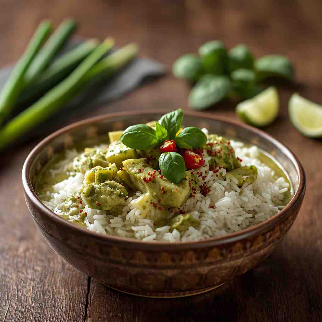 Thai Green Curry with Jasmine Rice is a vibrant and aromatic dish that combines the rich flavors of coconut milk, fresh herbs, and spicy green curry paste with tender meat and vegetables. This classic Thai dish is both comforting and exotic, offering a perfect balance of heat, sweetness, and freshness. Paired with fragrant jasmine rice, it becomes a complete and satisfying meal ideal for lunch or dinner.