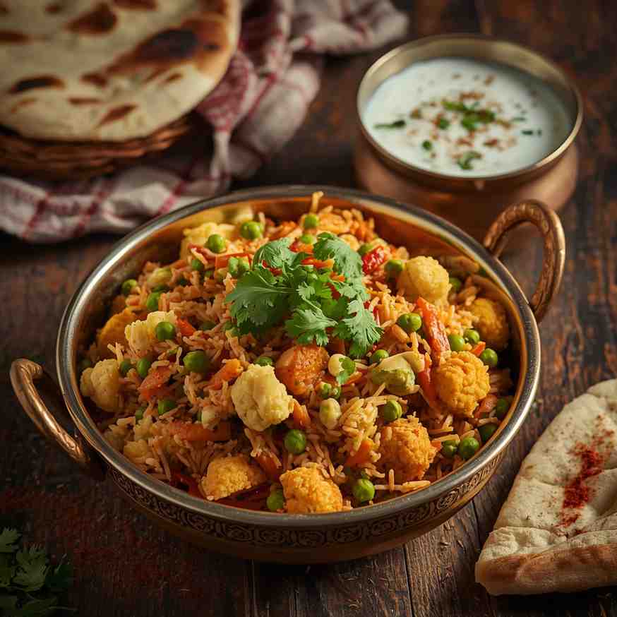 Biryani has deep cultural roots across India, with variations like Hyderabadi, Lucknowi, and Kolkata styles, each having its own distinctive flavor and cooking method. The vegetable version is a delightful, lighter take on the traditional meat biryani — yet every bit as aromatic and satisfying.