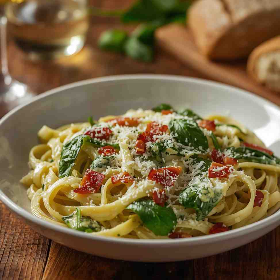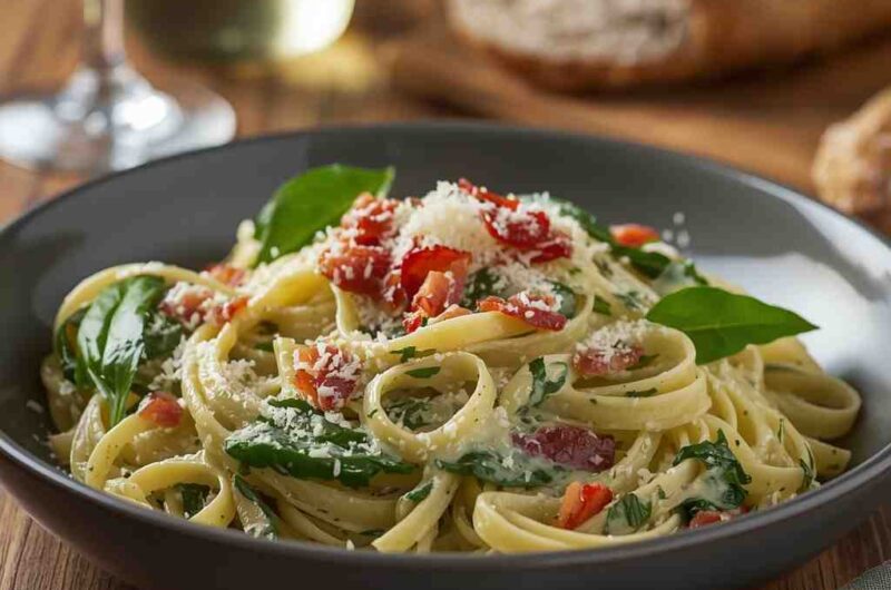 This recipe is a must-try because it elevates classic Alfredo pasta to a whole new level with the addition of crispy bacon and fresh spinach. It’s creamy without being overly heavy, indulgent without being complicated, and perfect for anyone who wants a satisfying meal without spending hours in the kitchen. The textures—crispy bacon, velvety sauce, tender pasta, and soft spinach—work perfectly together.