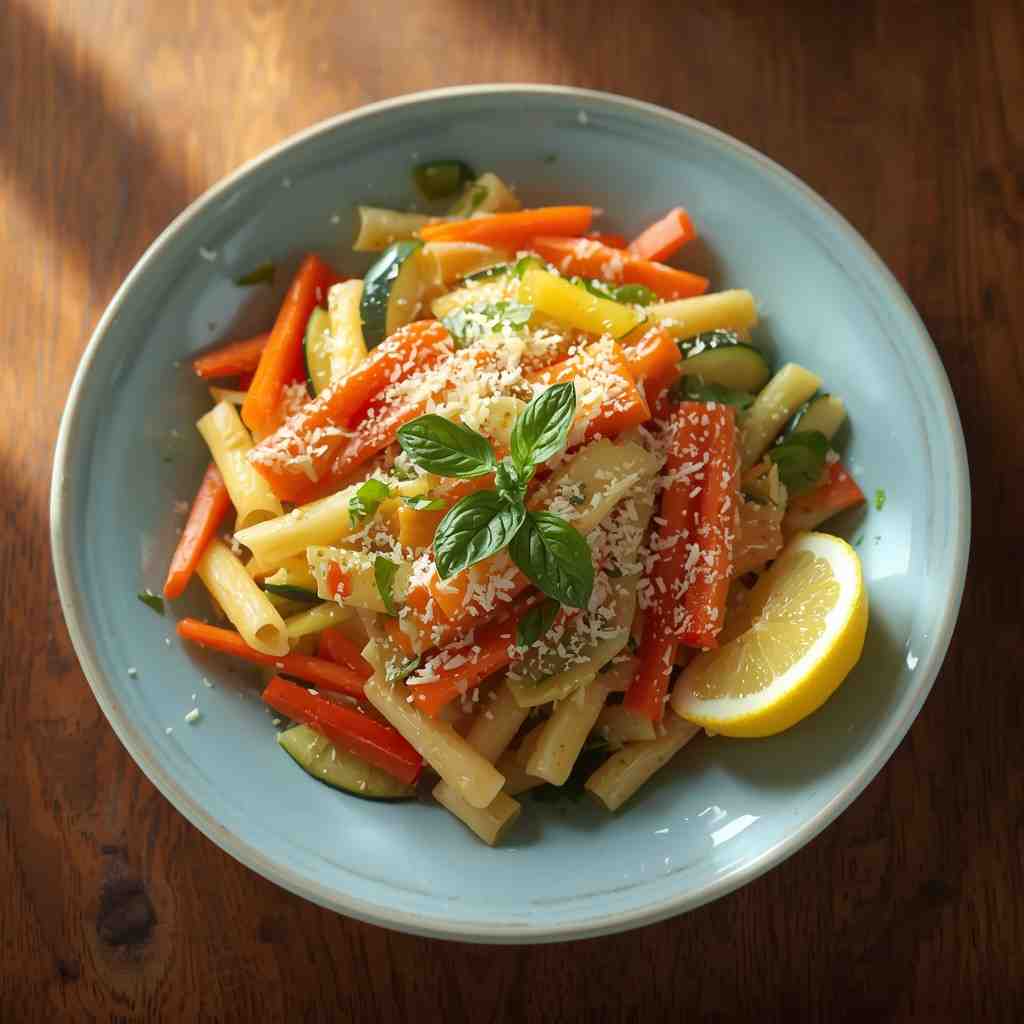 - Step 5: Serve : Plate the pasta and vegetables in bowls. Garnish with fresh basil or parsley and grated Parmesan. Serve immediately while hot.