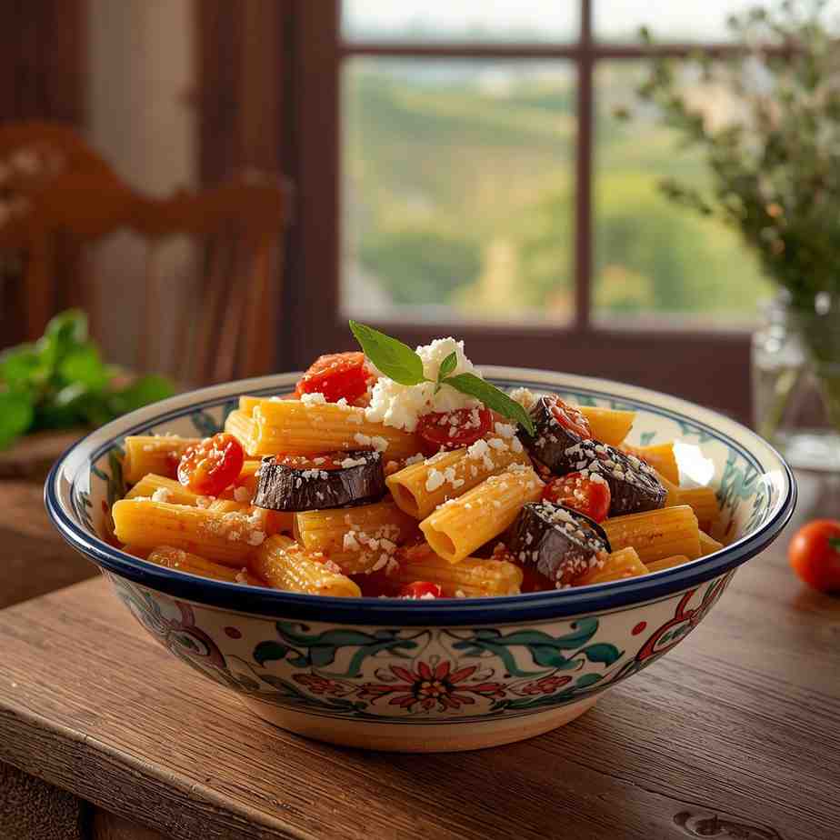 Serve Rigatoni alla Norma hot with extra ricotta salata and fresh basil on top. Pair with a green salad, crusty bread, or a glass of Sicilian red wine for a complete meal.