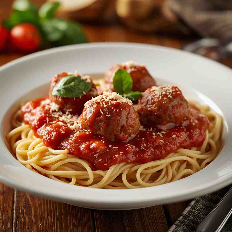 • Step 6: Serve : Plate spaghetti and spoon meatballs and marinara sauce on top. Garnish with grated Parmesan and fresh parsley or basil. Serve warm with garlic bread or a side salad.