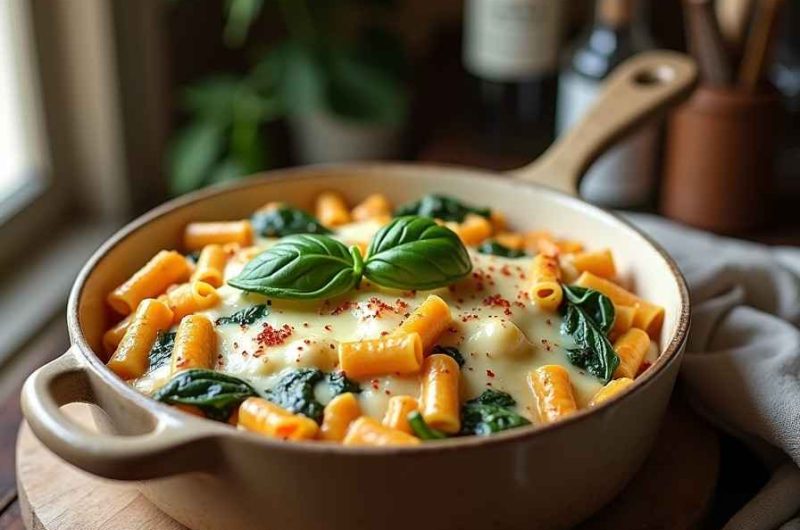 Spinach & Artichoke Pasta Bake with Mozzarella is a creamy, cheesy, and comforting casserole that combines tender pasta with sautéed spinach, marinated artichokes, and a luscious cheese sauce. Inspired by the classic spinach and artichoke dip, this baked pasta version transforms the flavors into a hearty, crowd-pleasing main dish. Perfect for family dinners or potlucks, it’s an easy way to enjoy a creamy vegetable-packed meal that everyone will love.