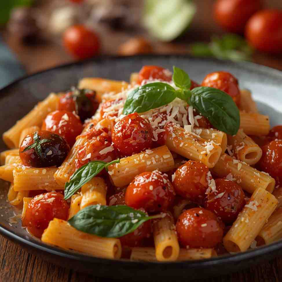 Vodka Rigatoni with Blistered Cherry Tomatoes is a luxurious yet comforting pasta dish that combines creamy tomato sauce, the subtle bite of vodka, and the sweetness of roasted cherry tomatoes. It’s Italian comfort food elevated with a modern twist — rich, silky, and bursting with flavor.