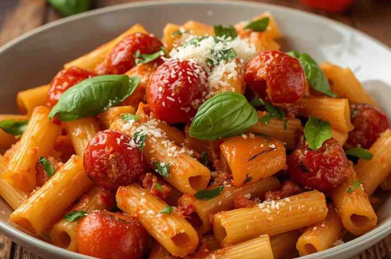 Vodka Rigatoni with Blistered Cherry Tomatoes is the ultimate comfort-meets-elegance pasta dish — rich, creamy, and full of layered flavors. The silky vodka sauce clings beautifully to the rigatoni, while the sweet cherry tomatoes add a burst of freshness that keeps every bite exciting.