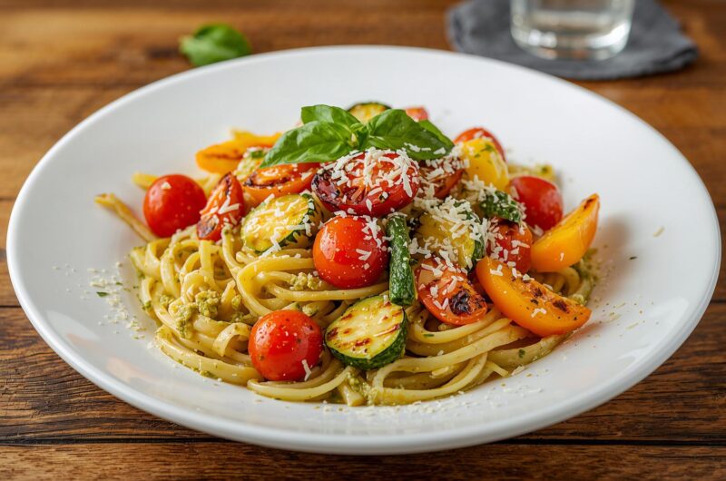 Basil Pesto Pasta with Grilled Vegetables is a vibrant, fresh, and flavorful dish that highlights the best of summer produce. Al dente pasta is tossed with a fragrant homemade or store-bought basil pesto, then combined with colorful grilled vegetables such as zucchini, bell peppers, and cherry tomatoes. The smoky char from the vegetables pairs perfectly with the aromatic, nutty pesto, creating a light yet satisfying meal.