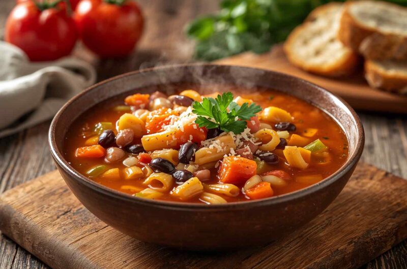 Pasta Fagioli Soup with Beans & Vegetables is a hearty, comforting Italian classic that warms you from the inside out. Its name literally means “pasta and beans,” and this soup brings together tender pasta, flavorful beans, and a medley of fresh vegetables in a rich tomato-based broth.