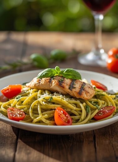Pesto Pasta with Grilled Chicken and Cherry Tomatoes