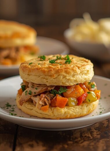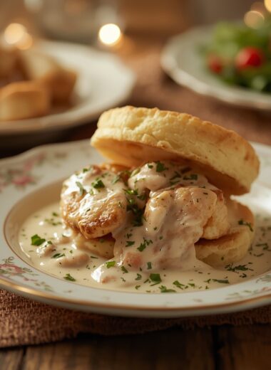 Chicken à la King over Buttermilk Biscuits