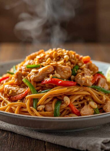 Chicken and Vegetable Pad Thai with Crushed Peanuts