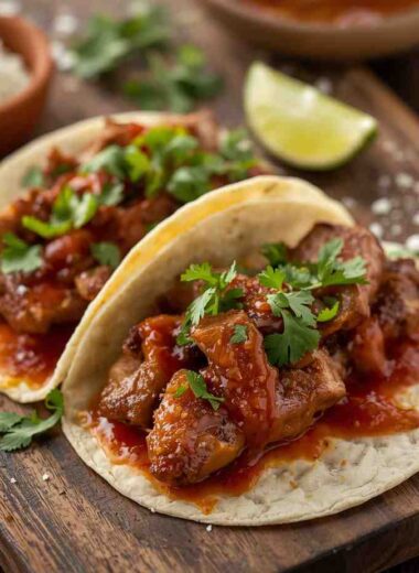 Crispy Pork Belly Tacos with Salsa Roja