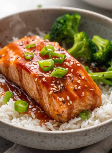 Teriyaki Glazed Salmon Bowls with Steamed Rice and Broccoli