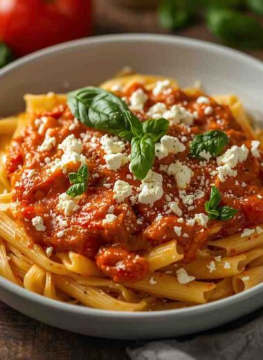 Creamy Roasted Red Pepper Pasta with Feta Crumbles
