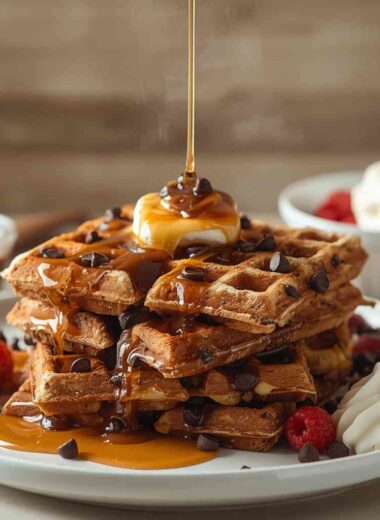 Chocolate Chip Waffles with Caramel Drizzle