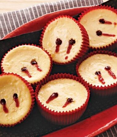 Vampire Bite Cheesecake Bites with Raspberry Sauce