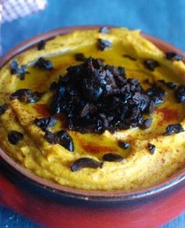 Spooky Pumpkin Hummus with Black Olive Garnish