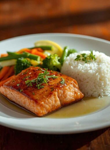 Honey Garlic Salmon with Jasmine Rice and Steamed Vegetables