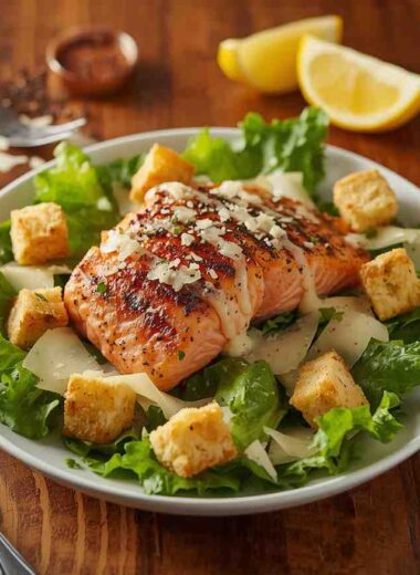 Blackened Salmon Caesar Salad with Garlic Croutons
