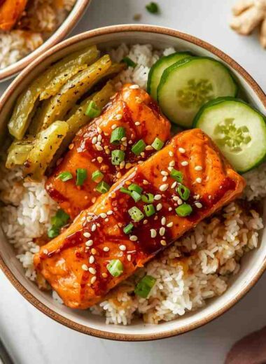 Asian Glazed Salmon Bowls with Jasmine Rice and Pickled Cucumbers