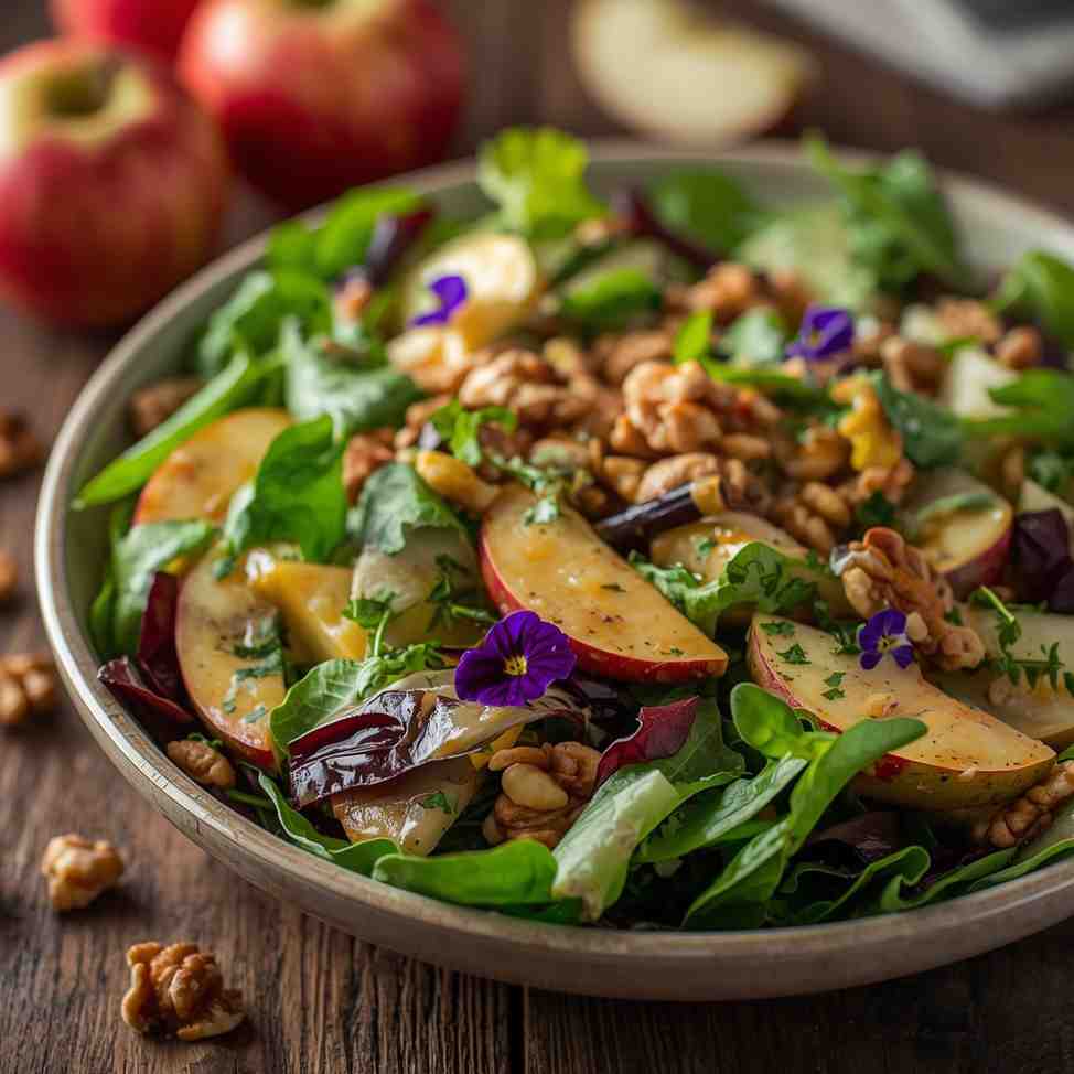 3. Assemble the Salad: In a large mixing bowl, combine greens, sliced apples, red onion, and toasted walnuts.