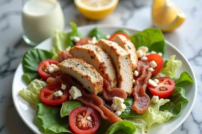- Assemble the Salad : Arrange lettuce on a large platter or bowl. Top with chicken, bacon, eggs, avocado, tomatoes, and cheese.