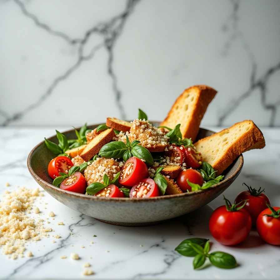 • Step 4: In a large salad bowl, combine halved tomatoes, diced cucumber, sliced red onion, and torn basil leaves. Add toasted bread cubes.