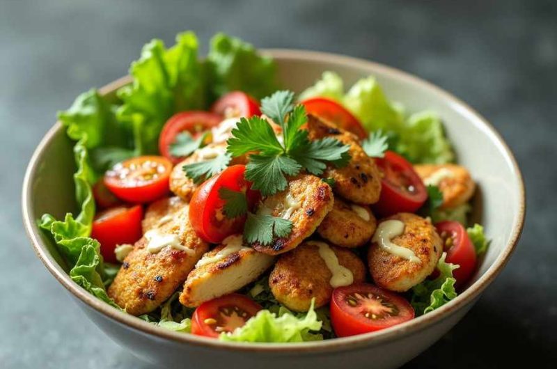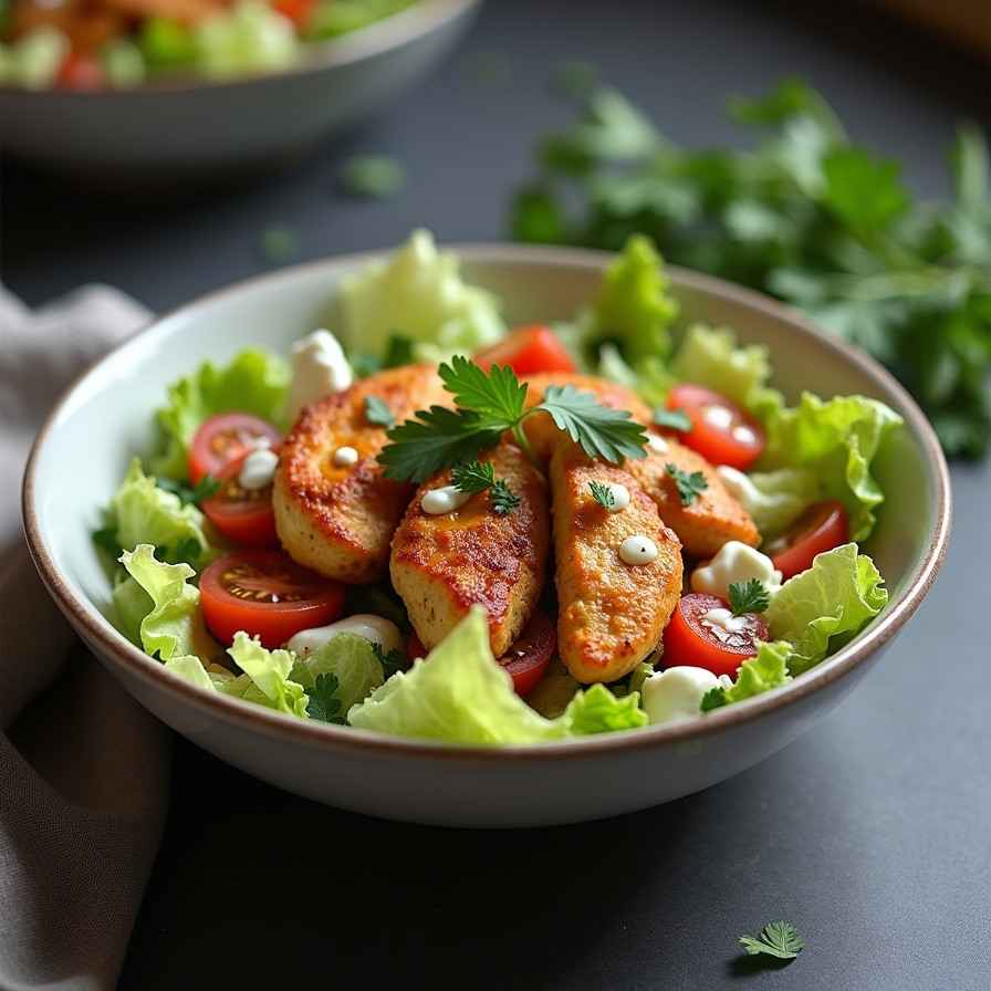 Marinate and cook the chicken until tender and lightly charred, then assemble with fresh vegetables and a light dressing.