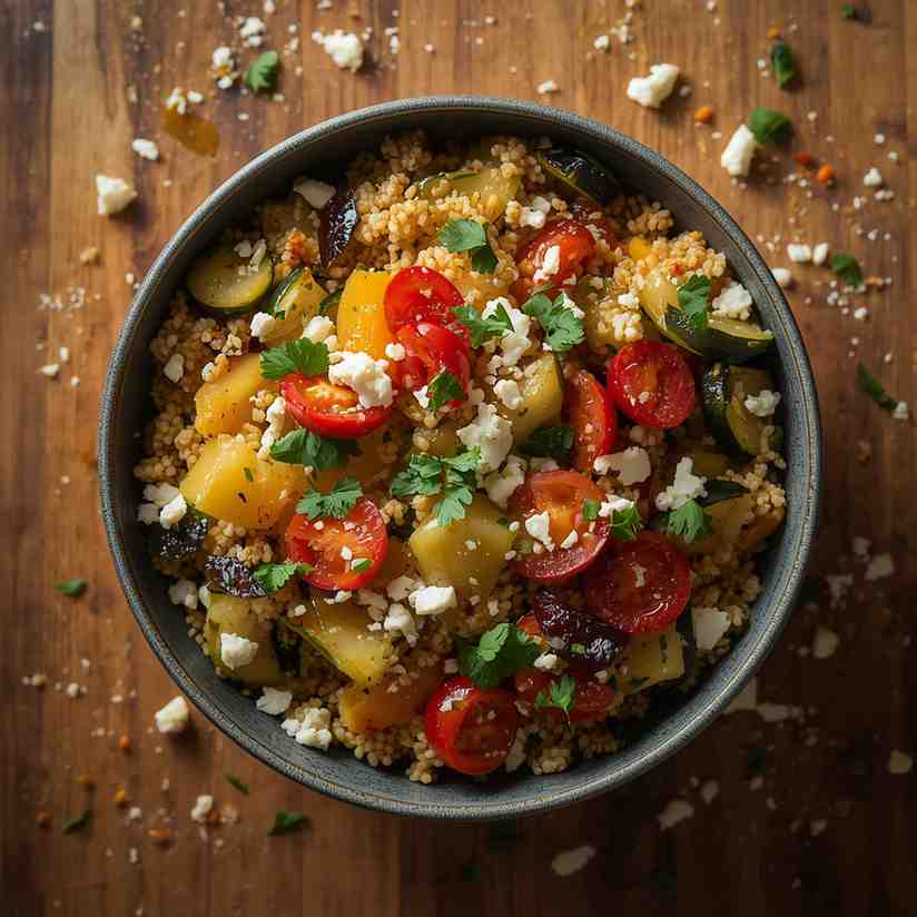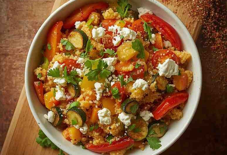 The Couscous Salad with Roasted Vegetables and Feta is a vibrant, wholesome dish that combines fluffy couscous with sweet roasted vegetables, briny Kalamata olives, and creamy feta cheese. Tossed in a light lemon-olive oil dressing and finished with fresh herbs, this salad is bright, flavorful, and satisfying.