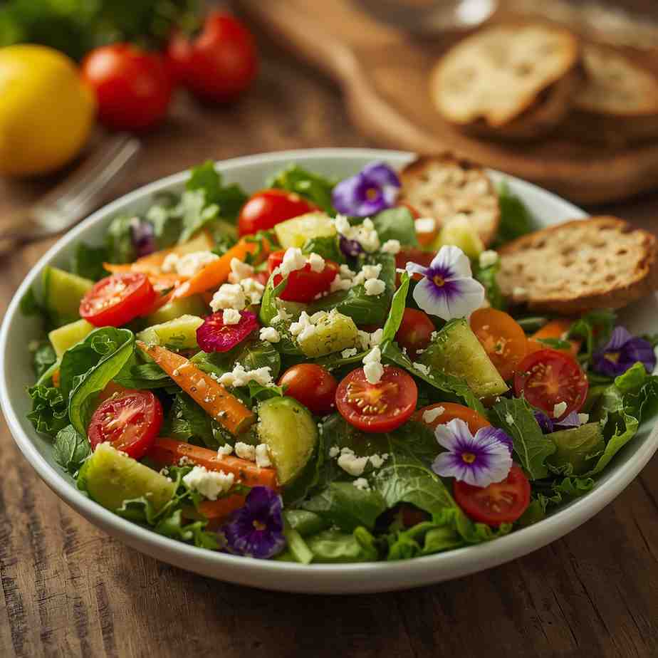 A Garden Salad with Lemon Herb Dressing is a timeless classic that celebrates the freshness and vibrancy of seasonal vegetables. Crisp greens, juicy tomatoes, crunchy cucumbers, and sweet bell peppers come together in harmony, dressed with a zesty lemon herb vinaigrette that brightens every bite. This salad is the ultimate symbol of clean, wholesome eating — light, refreshing, and full of color.