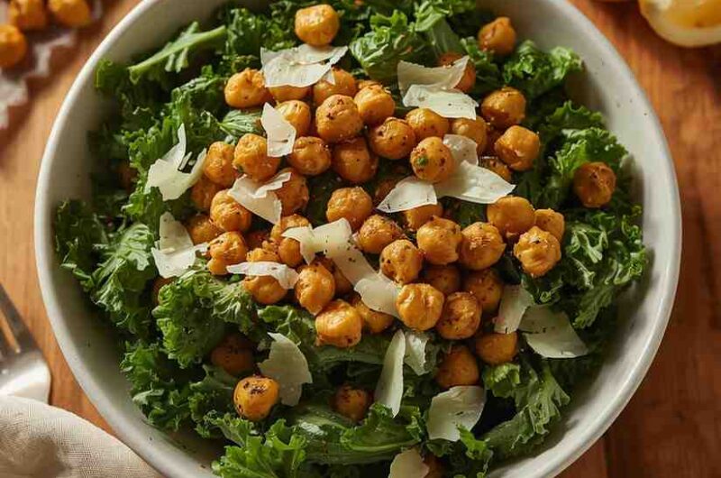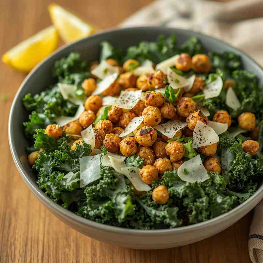 - Assemble Salad: Mix kale with remaining dressing, add roasted chickpeas, and sprinkle Parmesan.