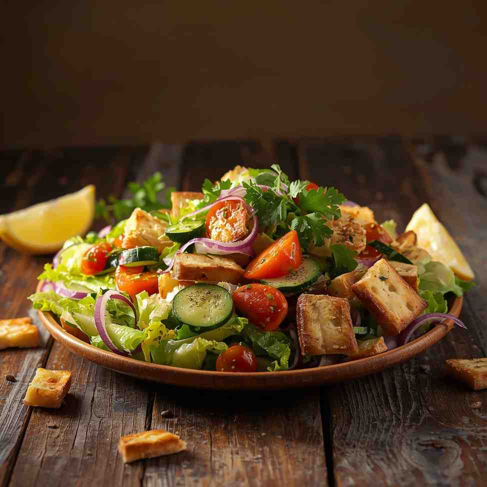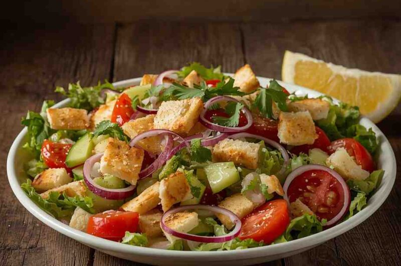 Fattoush is more than just a salad — it’s a celebration of freshness, texture, and color straight from the heart of the Middle East. Originating from Lebanon, this beloved salad combines crisp romaine lettuce, juicy tomatoes, cucumbers, radishes, fresh herbs, and crunchy pieces of toasted pita bread, all tossed in a zingy lemon-sumac dressing.